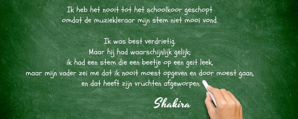 Ik heb het nooit tot het schoolkoor geschopt omdat de muziekleraar mijn stem niet mooi vond. Ik was best verdrietig. Maar hij had waarschijnlijk gelijk; ik had een stem die een beetje op een geit leek, maar mijn vader zei me dat ik nooit moest opgeven en door moest gaan, en dat heeft zijn vruchten afgeworpen.