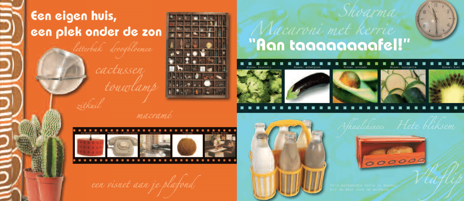 Oranje banken, groene tegeltjes, bruin behang, planten in oranje potten of macramé hangers, droogbloemen, zitkuilen, joekels van luidsprekerboxen, lavalampen, letterbakken, cactussen en langzamerhand overal verwarming. Het was knus en gezellig in huis in de jaren ’70. Een paar jaar later sloeg het om naar minimalistisch design. Veel zwart leer, glas, grijze muren, lamellen en design keukenapparatuur en accessoires van Starck en Alessi.